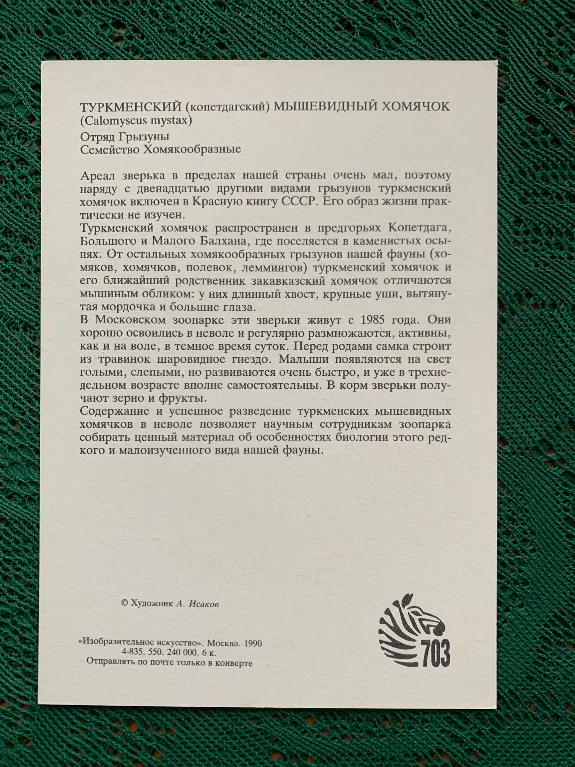 Russian art postcard - Artist A.Isakov - TURKMEN MOUSE HAMSTER - Animal postcard - Printed in USSR - 1989 - unused