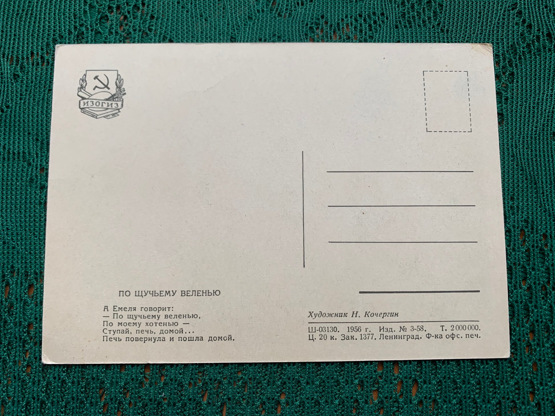 Vintage unused postcard from a fairy tale "By Pike's Order". Drawing by N.Kochergin. Printed in USSR. Good vintage condition. Text in Russian and English on backside. More information on photos. Approximate size: 10 x 15 cm // 4" x 6". Surprise your friends and family - send them lovely postcards :)