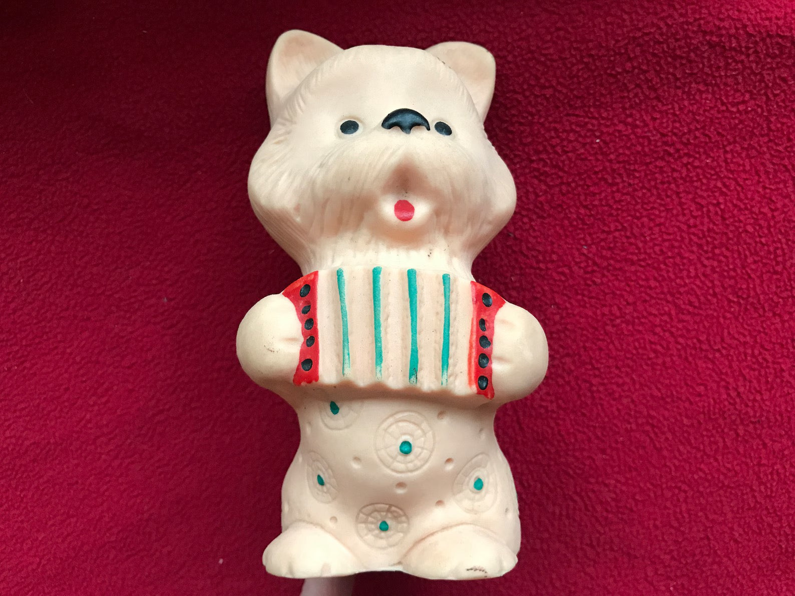 Rare find! Vintage 1970s rubber toy - CAT playing Garmon Karmoshka - Made in Soviet Union. Lovely USSR retro toy. Collectible vintage toy. Price in Roubles underneath. It is in good vintage condition. Made in Soviet Union. Height approximately 11 cm - 4.33 in, width 8 cm - 3.15 in