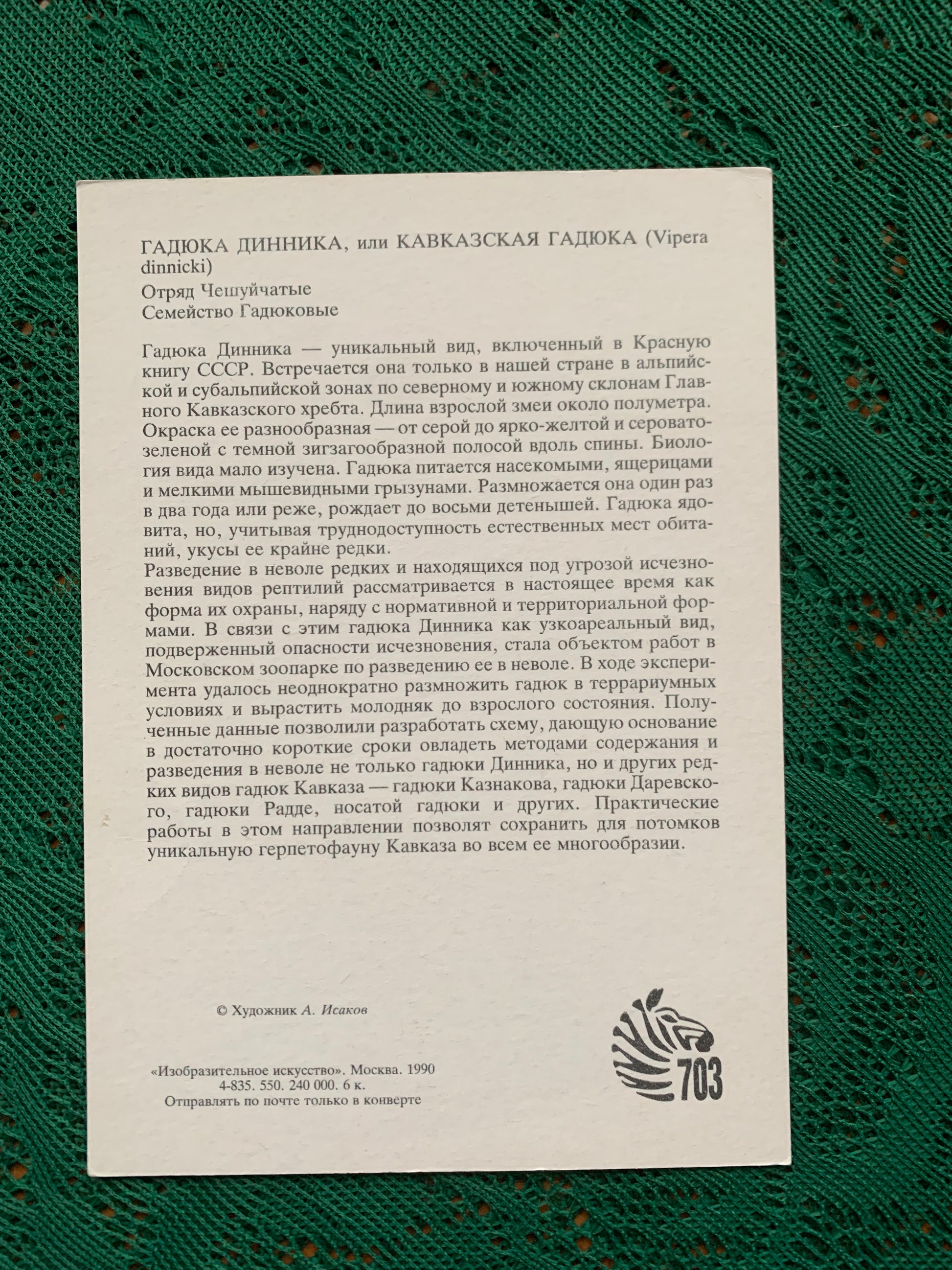 Russian art postcard - Artist A.Isakov - CAUCASIAN VIPER - Animal postcard - Printed in USSR - 1989 - unused